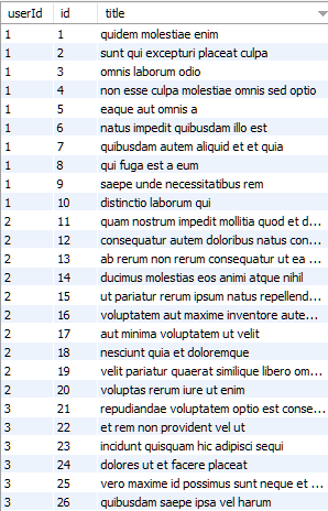 1 2 3 4 5 6 7 8 9 10 | CREATE DATABASE albumdb; USE albumdb; CREATE TABLE album ( userId INT, id INT PRIMARY KEY, title VARCHAR(200) ); SELECT * FROM album; | cs |