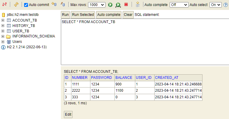 1 2 3 4 5 6 7 8 9 10 11 12 13 14 15 16 17 18 19 20 21 22 | -- 유저 샘플 데이터 INSERT INTO user_tb(username, password, fullname, created_at) values('길동', '1234', '고', now()); INSERT INTO user_tb(username, password, fullname, created_at) values('둘리', '1234', '애기공룡', now()); INSERT INTO user_tb(username, password, fullname, created_at) values('콜', '1234', '마이', now()); -- 계좌 샘플 데이터 INSERT INTO account_tb(number, password, balance, user_id, created_at) values('1111', '1234', 900, 1, now()); INSERT INTO account_tb(number, password, balance, user_id, created_at) values('2222', '1234', 1100, 2, now()); INSERT INTO account_tb(number, password, balance, user_id, created_at) values('333', '1234', 0, 3, now()); -- 거래 내역 샘플 데이터 -- 이체 내역을 기록 ( 1번 계좌에서 2번 계좌로 100원을 이체 ) INSERT INTO history_tb(amount, w_balance, d_balance, w_account_id, d_account_id, created_at) VALUES (100, 900, 1100, 1, 2, now()); -- 출금 내역 ( 1번계좌에서 100원을 출금 처리 ) INSERT INTO history_tb(amount, w_balance, d_balance, w_account_id, d_account_id, created_at) VALUES (100, 800, null, 1, null, now()); -- 입금 내역 (1번 계좌에 500원 입금 처리 ) INSERT INTO history_tb(amount, w_balance, d_balance, w_account_id, d_account_id, created_at) VALUES (500, null, 700, null, 1, now()); | cs |