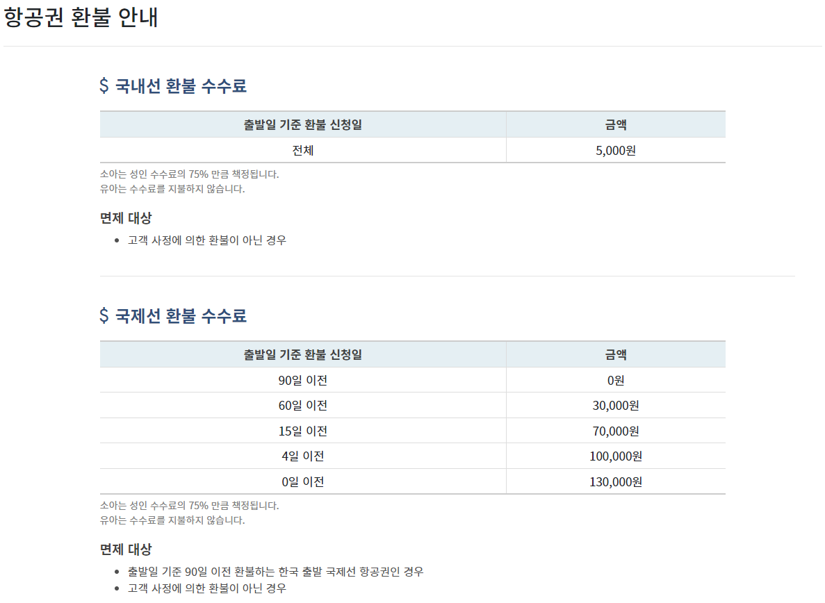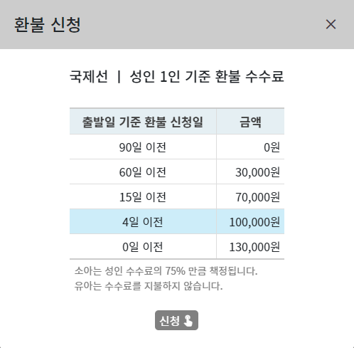- 환불 신청 버튼을 누르면 해당 티켓이 국제선인지 국내선인지 확인하고, 그에 해당하는 환불 수수료를 안내함