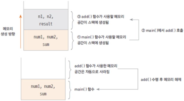- 함수가 호출될 때, 그 함수의 지역변수들에게 할당되는 메모리