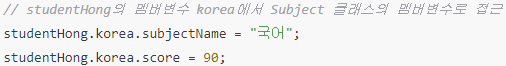 // studentHong의 멤버변수 korea에서 Subject 클래스의 멤버변수로 접근