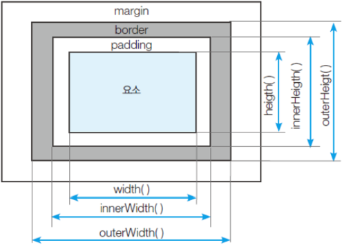 - 요소 + 패딩 + 테두리 너비 : $("요소").outerWidth();