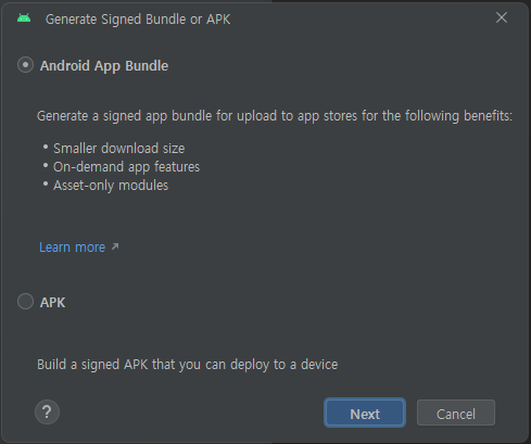 - 앱스토어에 배포 → 'Android App Bundle' (.aab 파일 생성)