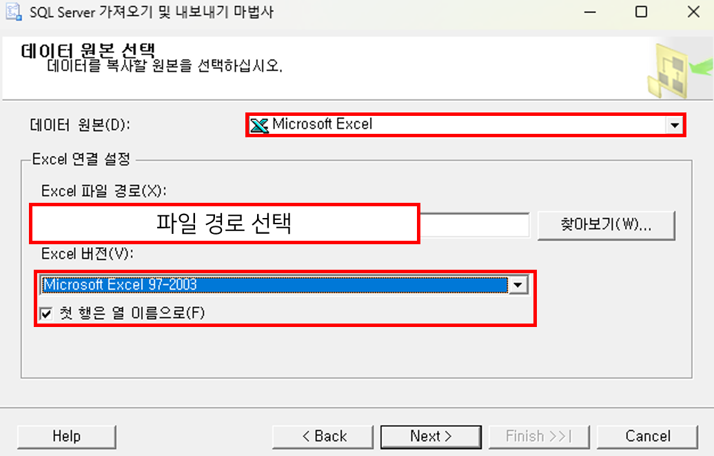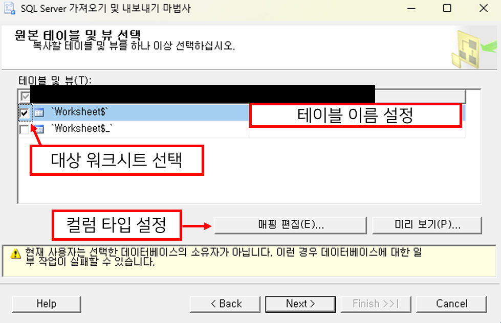 v. 워크시트 선택 & 테이블 이름 설정 & 컬럼 타입 설정