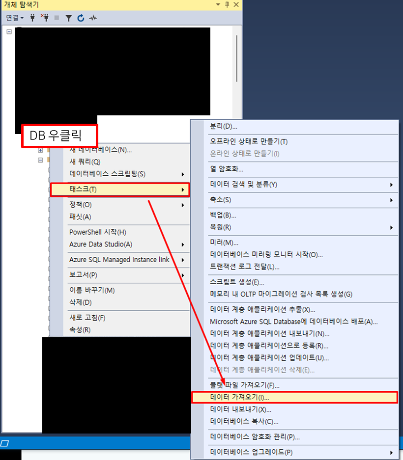i. 개체 탐색기에서 대상 DB 우클릭 → [태스크] → [데이터 가져오기]