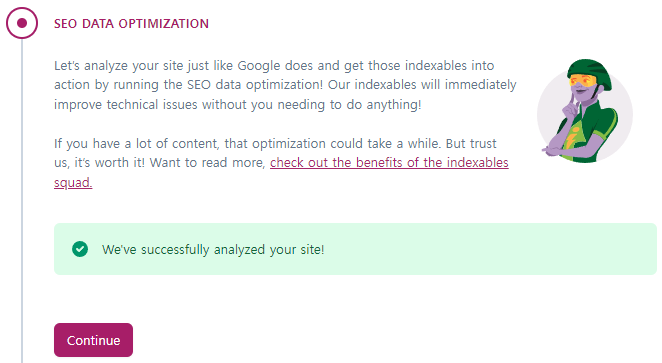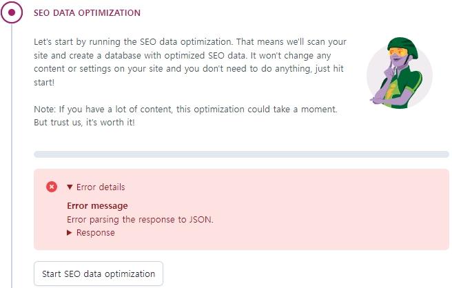 설정할 때 첫 단계에서 'SEO DATA OPTIMIZATION'을 실행하는데, 해당 부분에서 에러가 발생했다.