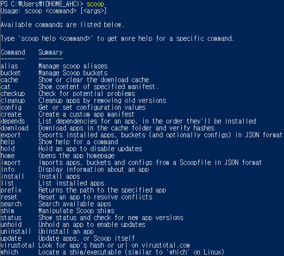 설치 후 'scoop'이라고 입력했을 때 아래와 같은 형식으로 출력되면 설치가 완료된 것이다.
