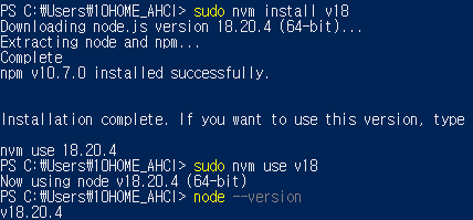 설치 후 'node --version'이라고 입력했을 때 버전명이 출력되면 설치가 완료된 것이다.