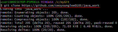 - 로컬 저장소 폴더로 지정된 상태에서, git clone 저장소주소 입력