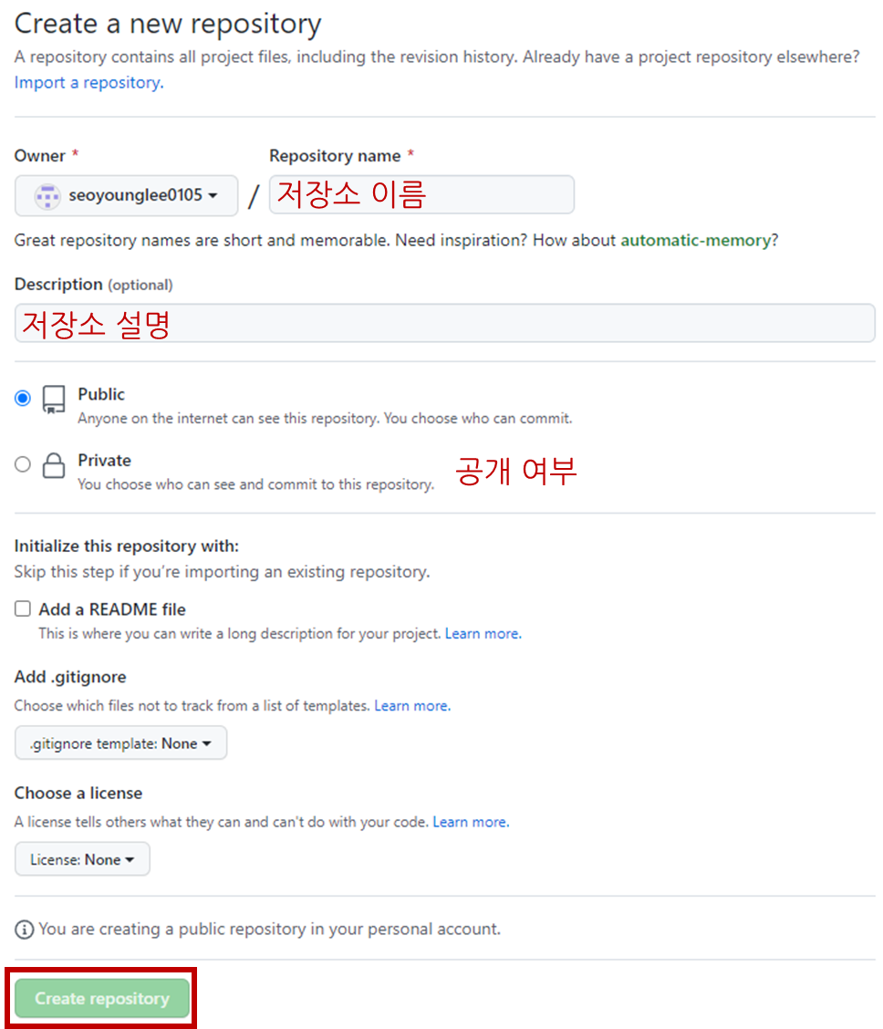 3. 설정 후 'Create repository' 선택하면 저장소가 만들어짐